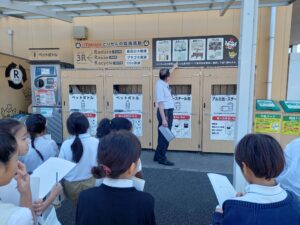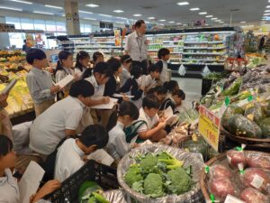 次に、自分たちが普段食べている食品がどのように売られているかを学習するためにスーパーマーケット「とりせん」を見学しました。店長さんから、食品がスーパーに届けられてからどのようにお客さんに購入されているのか、貴重なお話を伺うことができました。また、食品包装ゴミを減らすためのリサイクルの取り組みなどについても学ぶことができました。