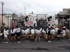 3年生たちは、自分たちが食べるものがどのように手元に届くのかを学ぶために、牛乳工場の社会科見学を行いました。パックされ、飲む人たちに届けられる前の牛乳が貯蔵されている大きなタンクを間近で見ることができました。工場では牛以外にも、チーズ・バター・ヨーグルトなどの乳製品がつくられていることも学ぶことができました。見学の後は、工場からご厚意のコーヒー牛乳が配られ、美味しくいただきました。
