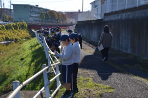 5年生の理科では、川についての学習を行い、川の流れる速さと侵食の関係について学んでいます。子どもたちの理解を深めるため、近くの蛇川まで歩いて行き、川の様子を観察しました。
