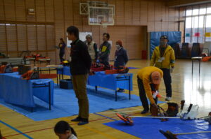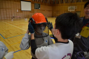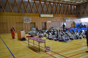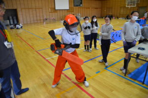 Today, Grade 5 was visited by volunteers from the Prefectural Forestry Division. They learned about the job of a forest ranger, and about the tools that forest rangers use to care for the forest. Then, they had an opportunity to use forestry tools to cut wooden logs which they used to craft their own personal drink coaster. It was an informative learning experience, and every student had a souvenir to take home as a memory of the event.