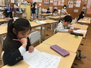 2年生は学習発表会に向けて、動物についての調べ学習をしています。児童一人ひとりが、人間を助ける仕事をしている動物について学びます。選んだ動物について話すスピーチ原稿を書き、学習発表会で保護者に説明するためのポスターを作成します。