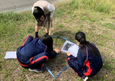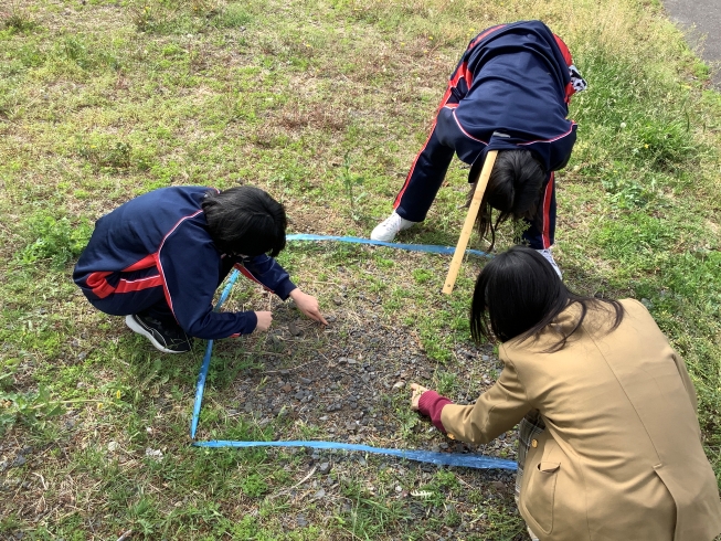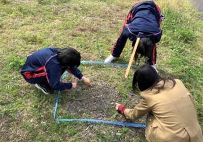さまざまなデータを自分で収集するスキルを学べることもこのコースの特徴の一つです。この日は、身の回りの環境の生物多様性を評価するため、コドラート法を用いて校庭の植物数をカウントし、逆シンプソン指数を計算するフィールドワークを行いました。