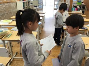2年生たちは、算数の授業で「ひょうとグラフ」について学んでいます。子どもたちはそれぞれ、クラスメートに尋ねる質問を考えました。そして、その質問に対する答えとして4つの選択肢を用意し、アンケートを作成しました。児童たちは回答を記録する際、数え棒(tally marks)の使い方を練習しました。データを収集した後、各児童はそのデータを使って棒グラフを作りました。活動終了後、子どもたちは完成したグラフをクラスに示し、データについて説明しました。グラフについて学んだだけでなく、クラスメートの好き嫌いの傾向についても少し知ることができました!