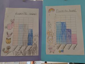 Grade 2 students are learning about tables and graphs in math class. The students each thought of a question that they could ask their classmates. They made a survey by giving four choices for the answer to their question. The students practiced using tally marks when they recorded the answers. After collecting the data, each student used the data to create a bar graph. After the activity, students showed their finished graphs and explained their data to the class. Students learned about graphs, but they also learned a little bit about the likes and dislikes of their classmates!